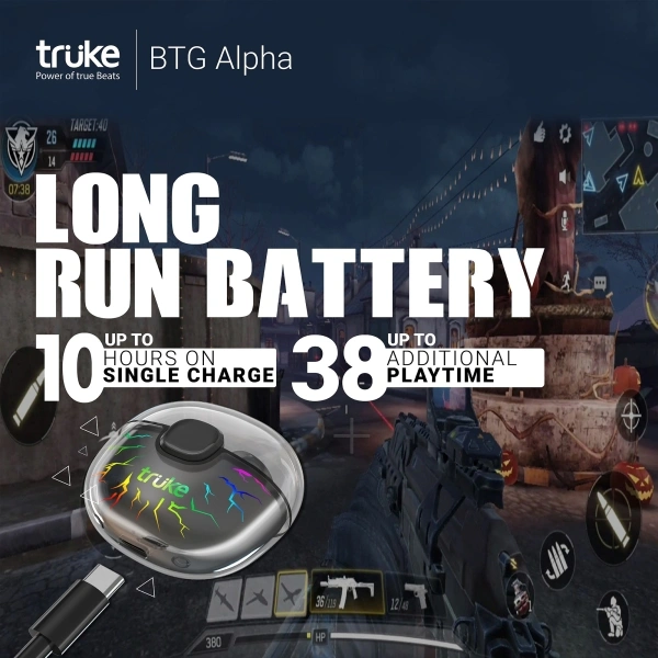 truke BTG Alpha Gaming TWS, 38H Playtime, 7RGB LEDs, AAC codec, Instant Pairing Bluetooth Headset